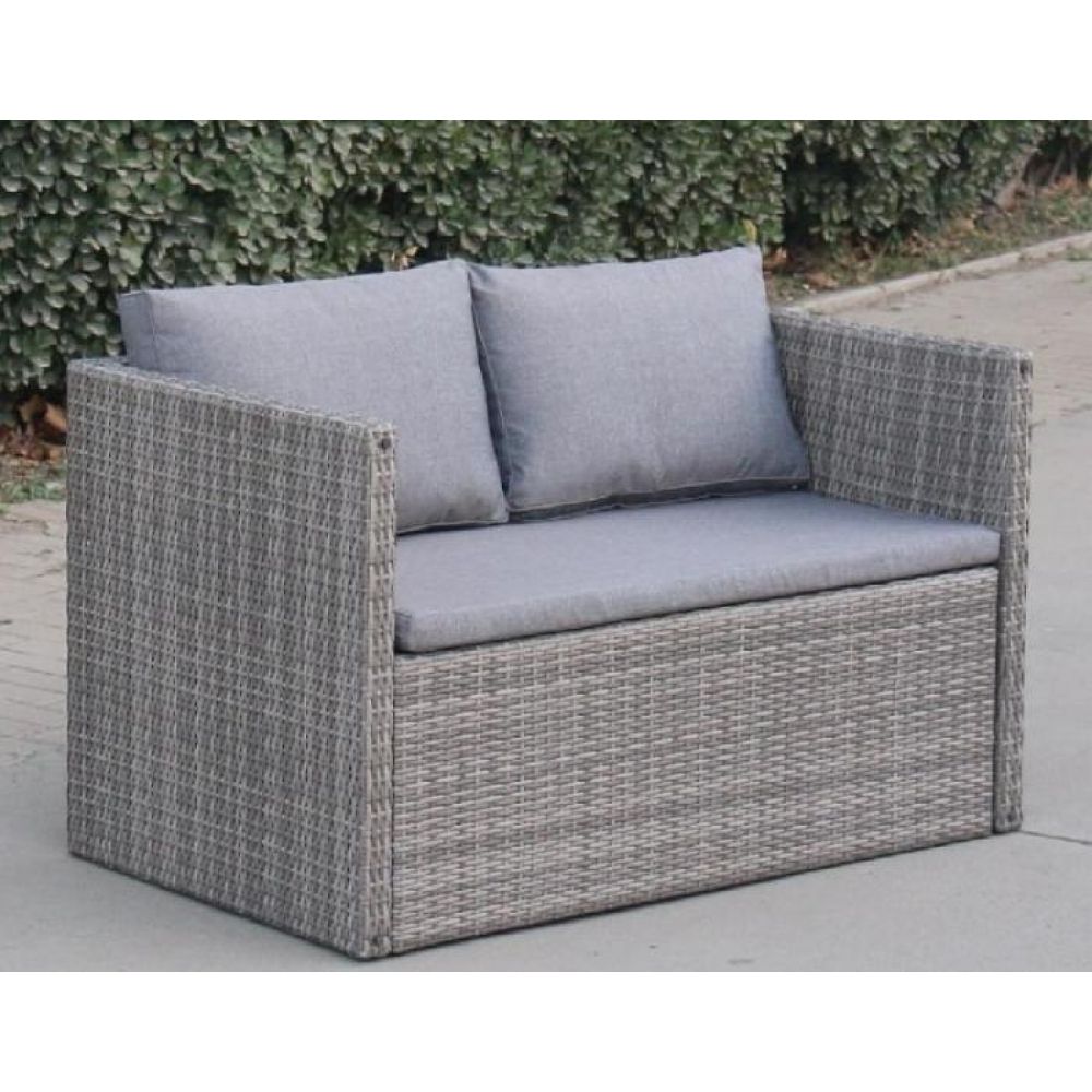 - Доп. инфо: В составе комплекта: диван, который трансформируется в обеденную группу: стол, лавочка и 2 пуфа. Высококачественная лоза из полиротанга серого цвета стойкая к любым атмосферным явлениям. Крепкий стальной каркас с полимерным антивандальным покрытием и отличным качеством сварки.